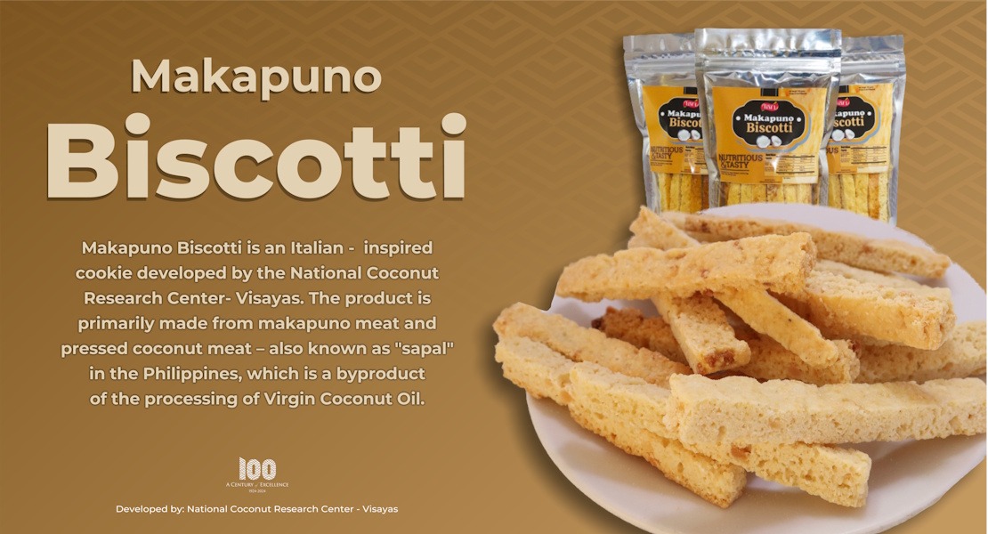 Makapuno Biscotti is an Italian-inspired cookie developed by VSU’s National Coconut Research Center- V. Baked twice in order to achieve the perfect texture, the product is also a potential source of protein and fiber which is good for your health.